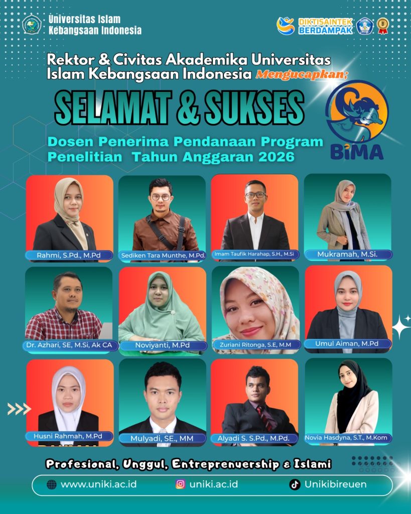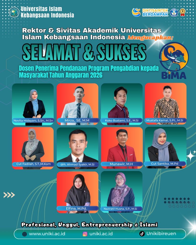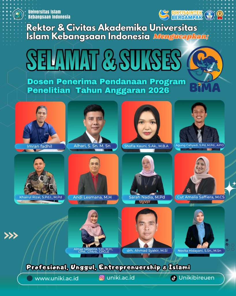 Bireuen- Universitas Islam Kebangsaan Indonesia (UNIKI) kembali menorehkan prestasi membanggakan di tingkat nasional. Sebanyak 33 dosen UNIKI dinyatakan lolos sebagai penerima pendanaan Program Hibah dari Kementerian Pendidikan Tinggi, Sains, dan Teknologi (Kemendiktisaintik) untuk Tahun Anggaran 2026. Jum’at (10/4/2026)